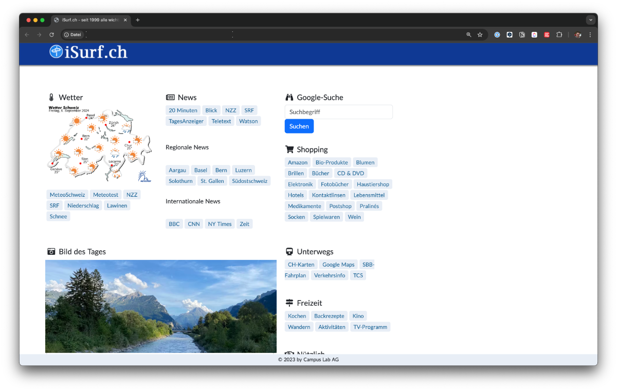 Am 09.09.99 ging das Meta-Portal iSurf.ch an den Start, am 09.09.24 haben wir die Seite offline genommen. Wir bedanken uns für 25 Jahre Treue 🙏